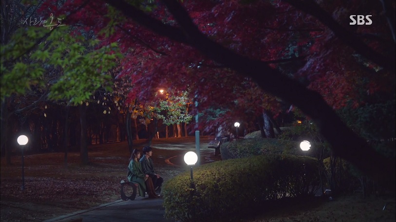 공원 벤치에 앉아 이야기를 나누고 있는 현수와 정선