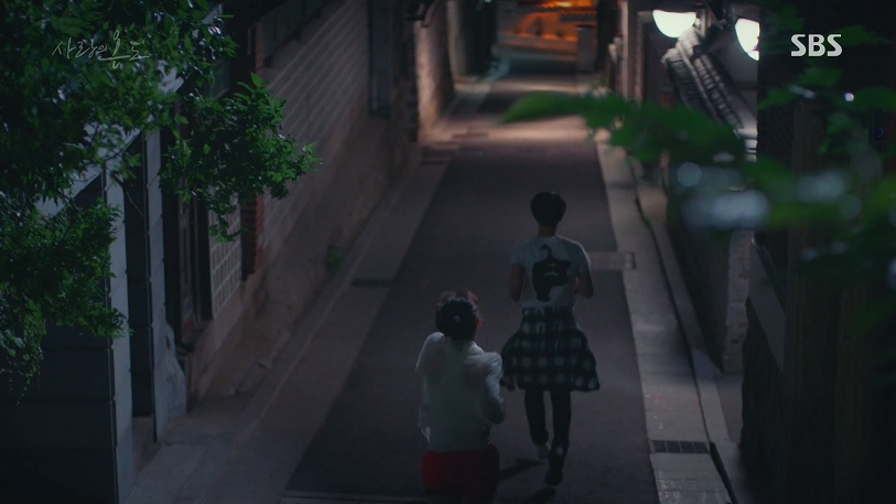 골목길을 달리던 중 갑자기 비가오는 장면